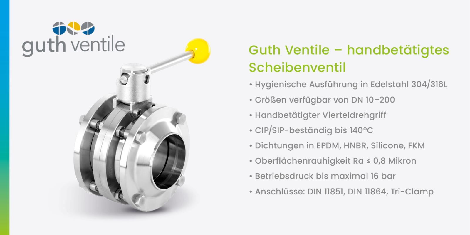 Guth Ventiltechnik ist ein deutscher Hersteller mit über 100 Jahren Erfahrung in der Entwicklung hygienischer Ventile, Tankarmaturen und Prozesskomponenten für anspruchsvolle industrielle Anwendungen. Die Produkte werden weltweit in der Lebensmittelindustrie, Molkereien, Getränkeproduktion, Pharma, Kosmetik, Chemie und Bioprozesstechnik eingesetzt – überall dort, wo Hygiene, Qualität und Prozesssicherheit entscheidend sind.