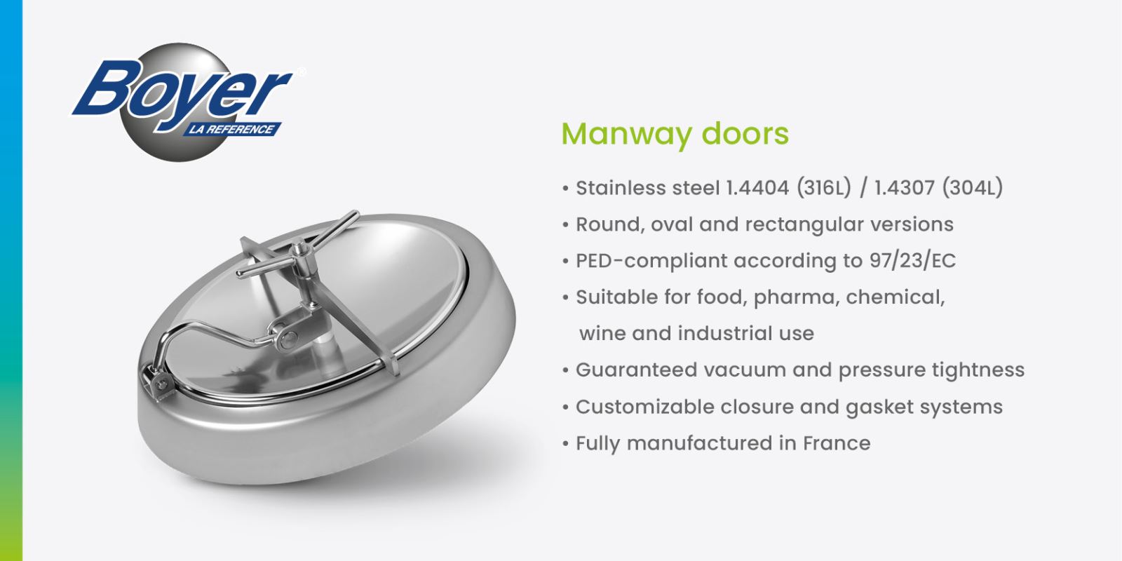 Boyer is active globally in the production of manways for various industries. With modern technologies, customer-oriented design and in-house production in France, they offer tailor-made solutions suited to both hygienic and pressure-rated applications.