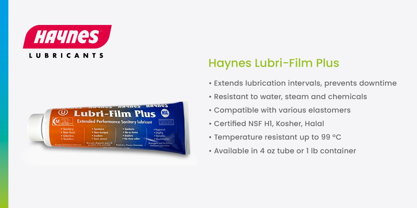 Whether it concerns bearings, pumps, valves or cutting and packaging equipment, Haynes lubricants ensure optimal operational efficiency. The Lubri-Film line (Plus, Spray and Heavy-Duty variants) in particular offers long-lasting lubrication performance, even under demanding conditions such as steam clean-in-place (CIP) applications.