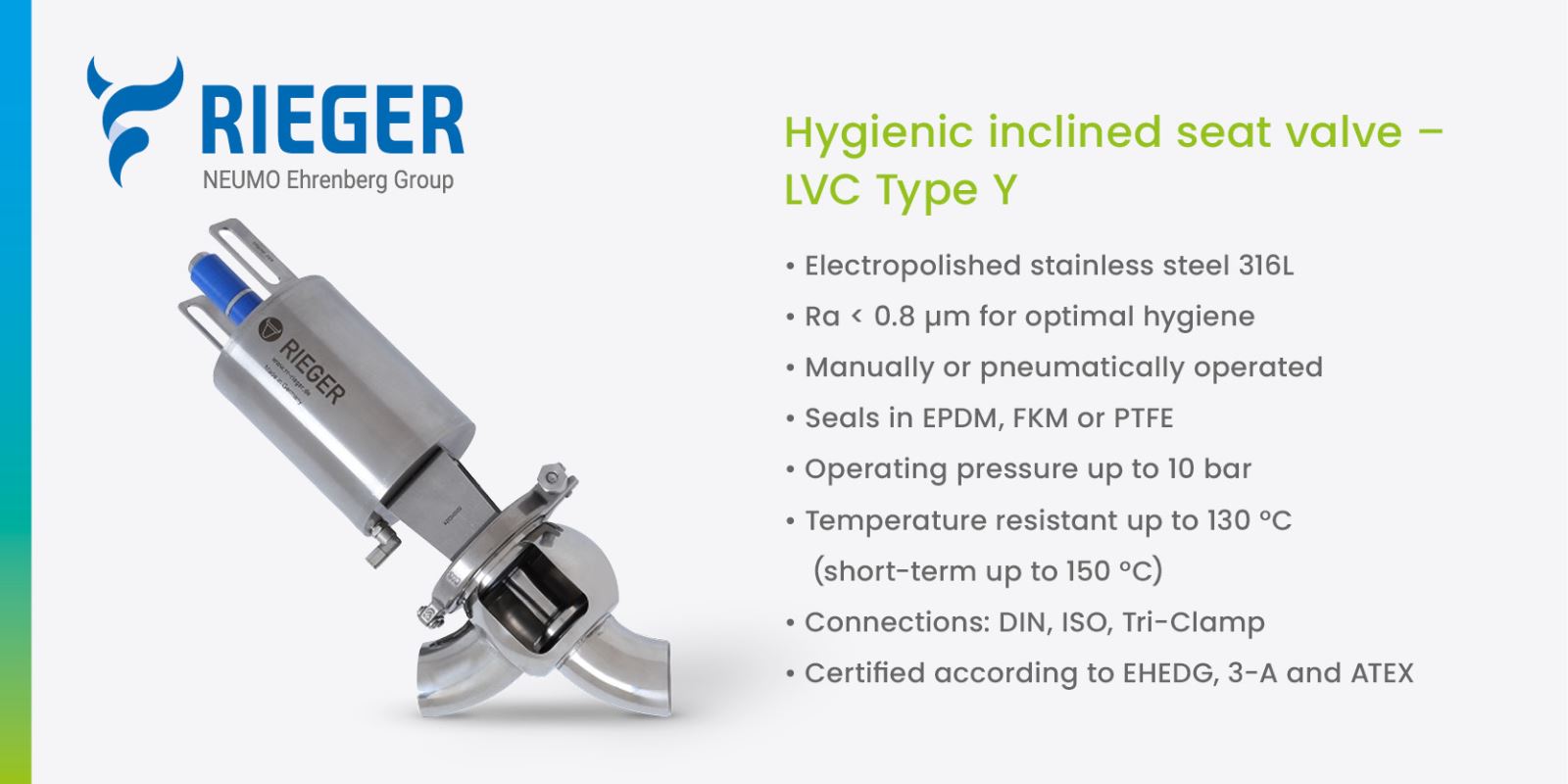 Rieger GmbH & Co. KG is a family-owned company based in Aalen, Southern Germany, and has been part of the internationally operating Neumo Ehrenberg Group for over seventy years. The company specializes in the development and production of hygienic valves and stainless steel process components. From its modern production facility in Aalen, Rieger supplies solutions worldwide for process installations where hygiene, precision and reliability are key. Rieger’s products are designed for use in the food industry, pharmaceutical manufacturing, chemical processing and biotechnology.