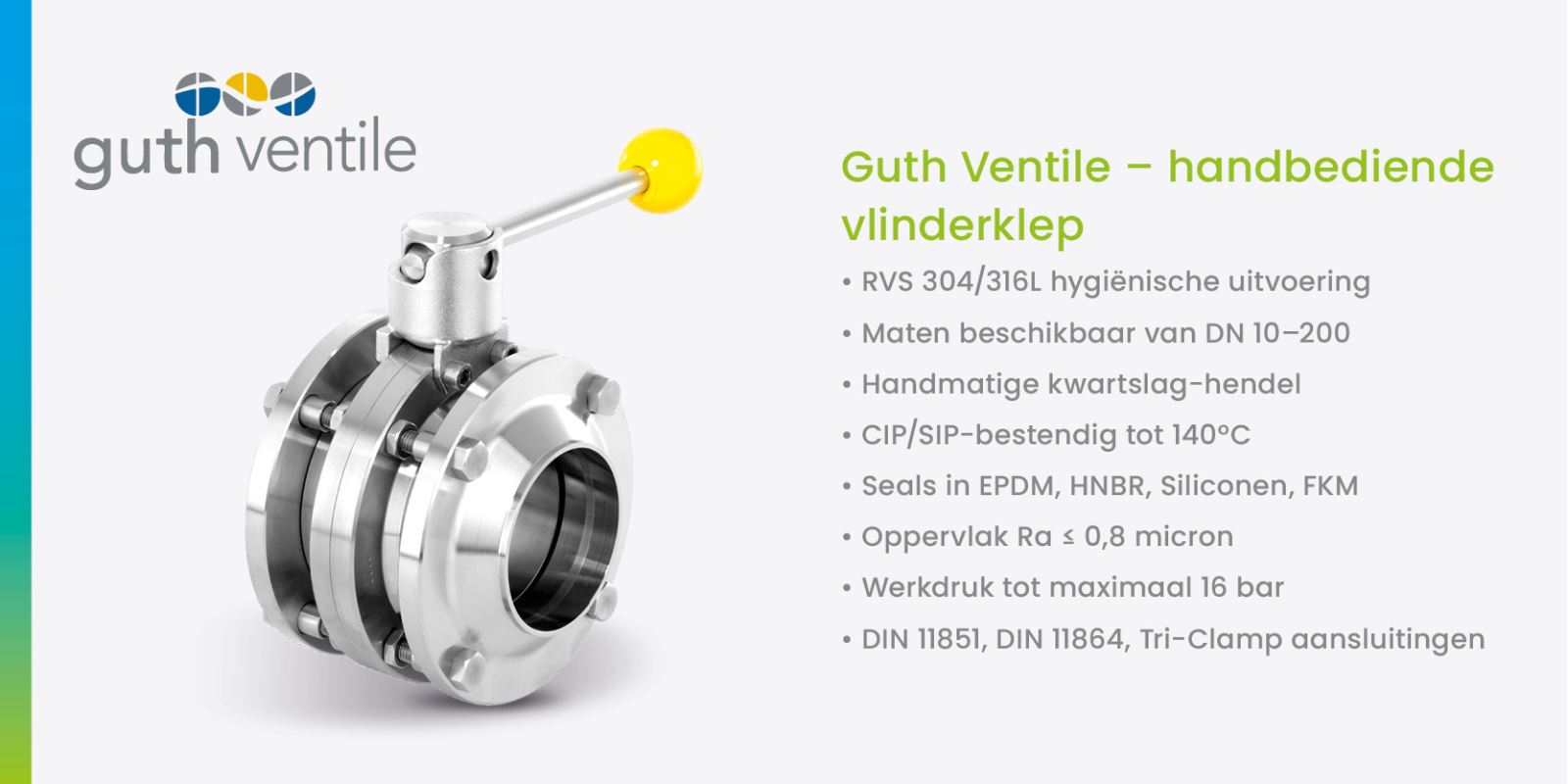 Guth Ventiltechnik is een Duitse fabrikant met ruim 100 jaar ervaring in het produceren van hygiënische afsluiters, tankfittingen en procescomponenten voor hoogwaardige industriële toepassingen. De producten worden wereldwijd ingezet in de voedingsmiddelenindustrie, zuivel, drankenproductie, farmacie, cosmetica, chemie en bioprocessing – overal waar hygiëne, kwaliteit en procesveiligheid van essentieel belang zijn.